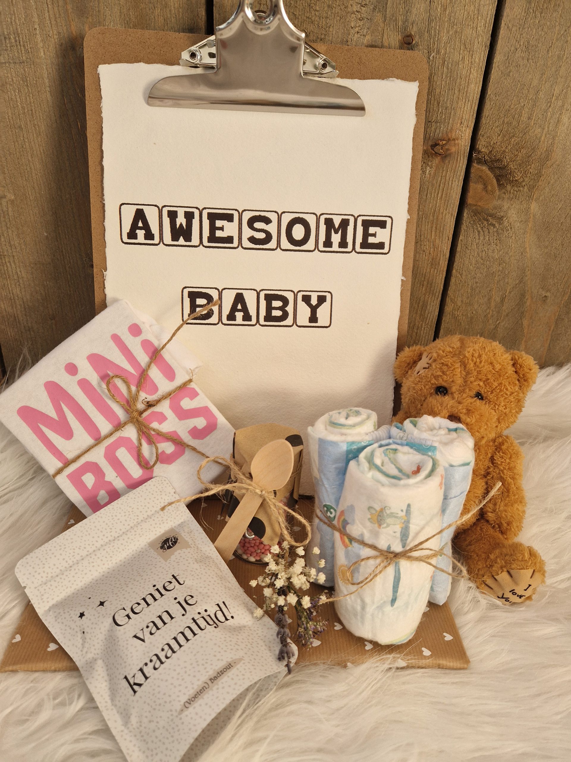 Verras kersverse ouders met dit originele en liefdevol samengestelde kraamcadeau voor een meisje! Deze luxe “Awesome Baby” giftset bevat alles om de kraamtijd extra speciaal te maken: een zachte knuffelbeer, drie schattig opgerolde luiers, een zakje voeten bath bombs met de tekst “Geniet van je kraamtijd!”, een houten lepeltje met mini-badparels, een “Mini Boss” washandje én een decoratieve kaart met de tekst “Awesome Baby” op een clipboard.