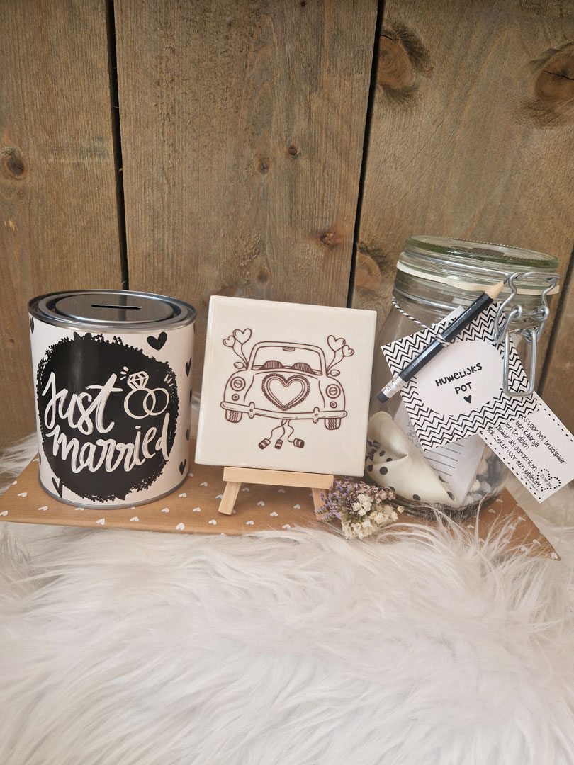 – “Huwelijkspot” een glazen pot vol leuke kaartjes voor het bruidspaar. Wat extra romantiek met een kaarsje en wat lekkers om samen te delen.