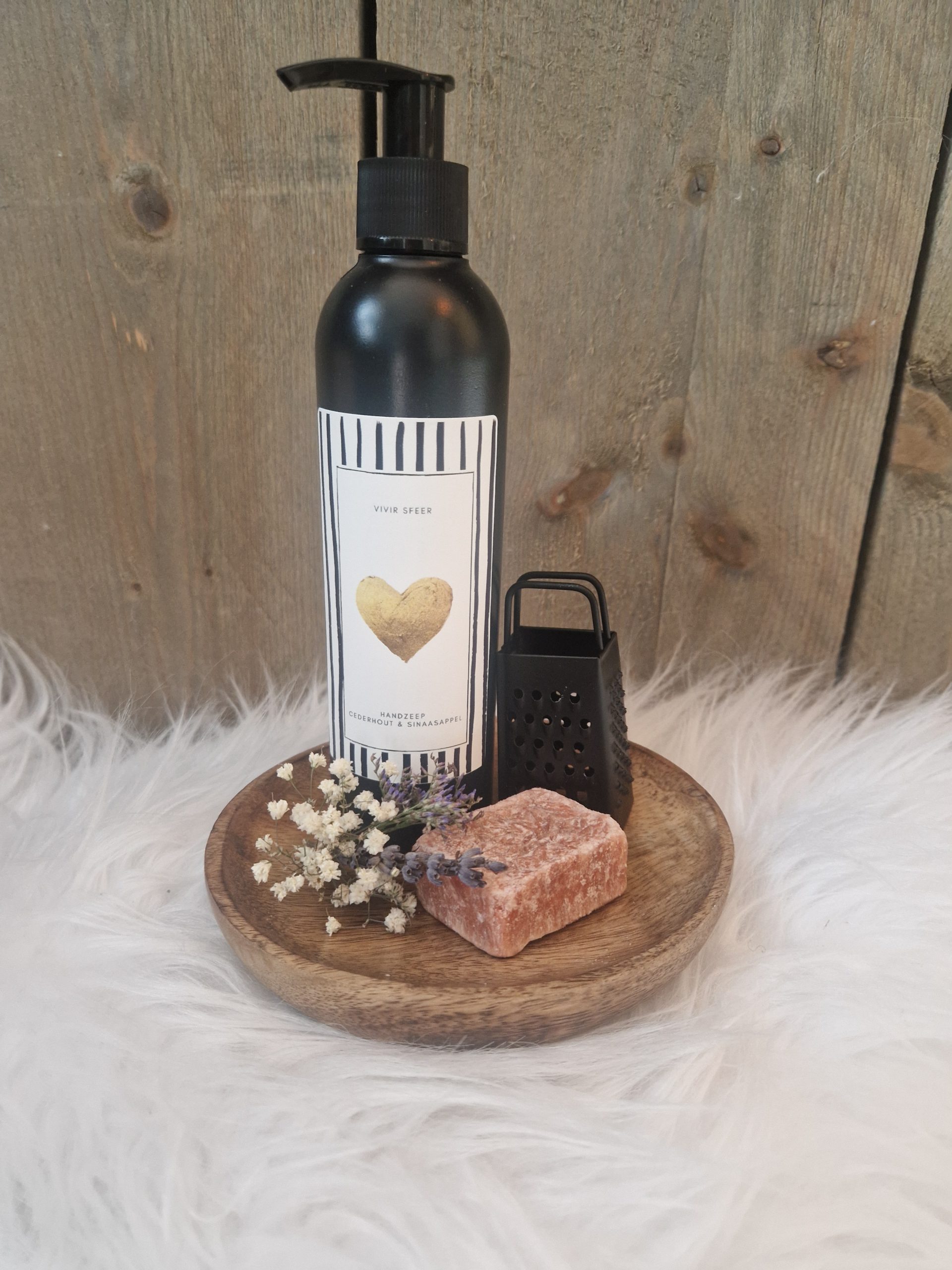 Elegante handzeepset met de geur van cederhout & sinaasappel, op houten schaaltje met waxblokje en droogbloemen. Een luxe en stijlvol cadeau!