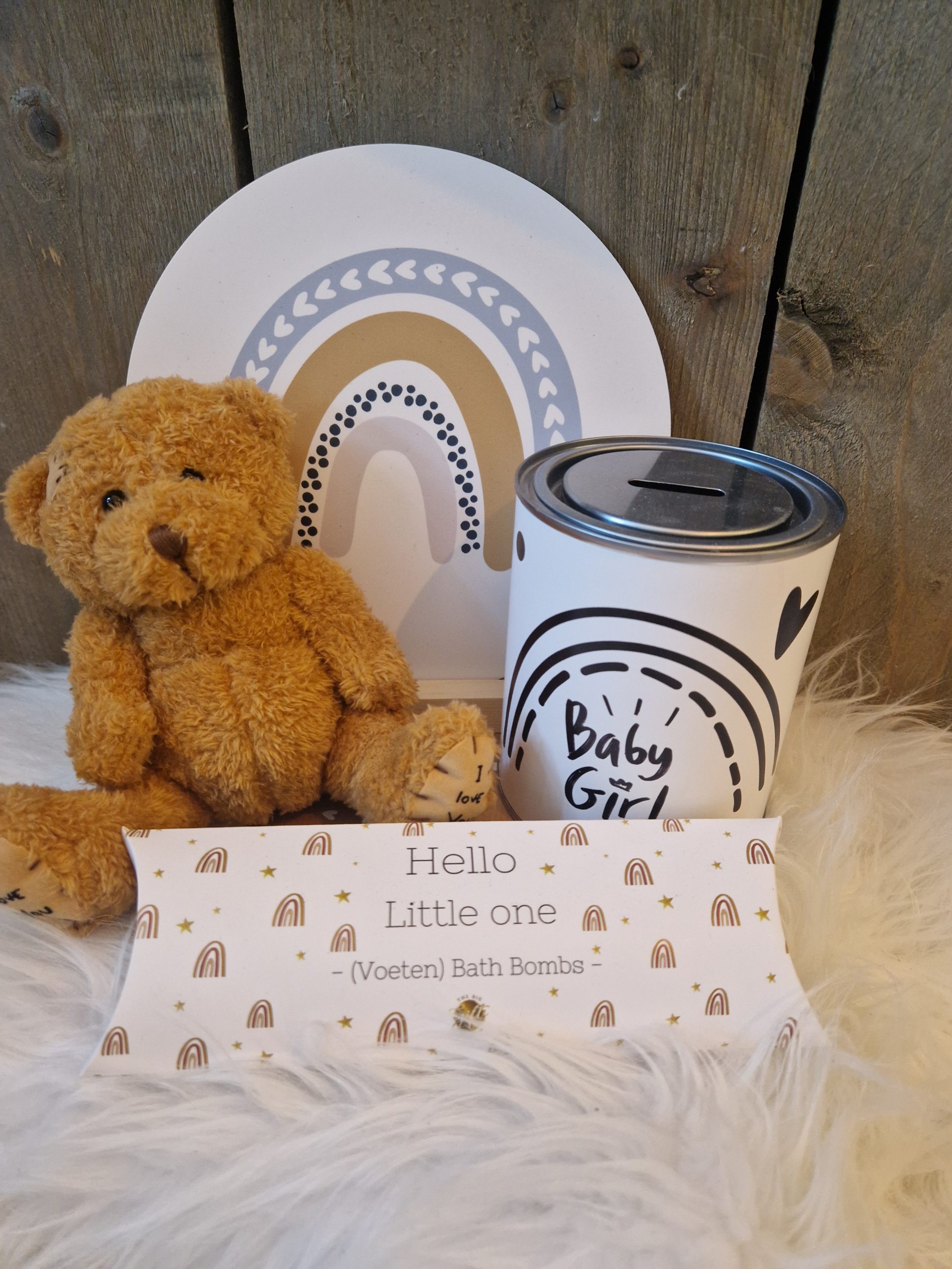 Een stijlvol babycadeau met knuffelbeer, spaarpot, regenboogbord en voeten bath bombs. Perfect als kraam cadeau of babyshower verrassing.