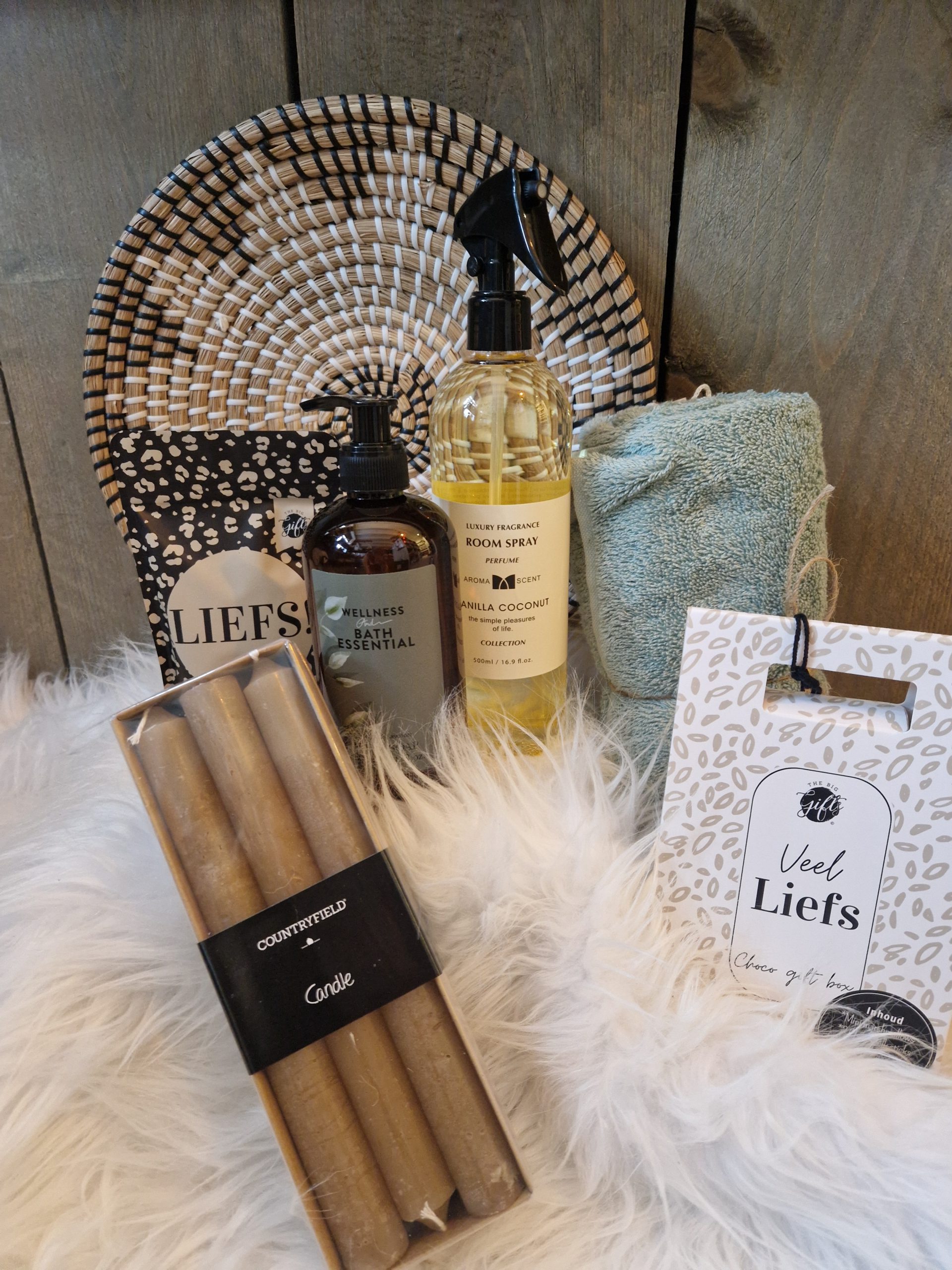 Complete luxe wellness giftbox met badolie, kaarsen, roomspray, chocolade en meer. Een stijlvol en ontspannend cadeau voor haar!
